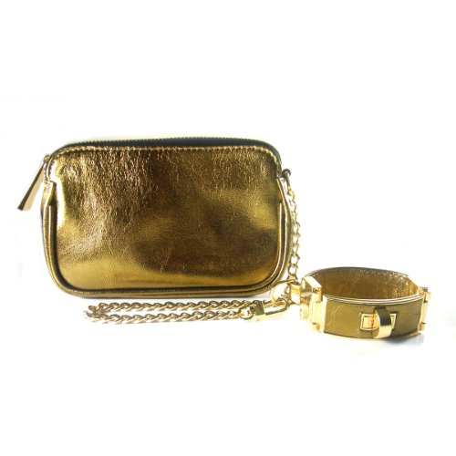 This leather clutch features a detachable bracelet and gold hardware. Lined interior features patch pocket.