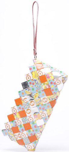 This Nahui Ollin Candy Clutch Wristlet Candy Wrapper Bag is made from recycled materials. It can take up to 4000 wrapper and 4 days to construct one bag! Be Eco fashionable and own a one of a kind piece today. This cute pouch fits right on your wrist and is perfect to fit the essentials such as your keys, credit cards, phone or makeup. The zipper closure and leather wrist strap help keep your items safe and secure.