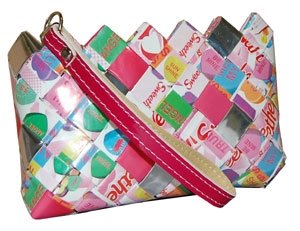 This Nahui Ollin Baby Cakes Candy Wrapper Bag is made from recycled materials. It can take up to 4000 wrapper and 4 days to construct one bag! Be Eco fashionable and own a one of a kind piece today. This cute pouch fits right on your wrist and is perfect to fit the essentials such as your keys, credit cards, phone or makeup. The zipper closure and leather wrist strap help keep your items safe and secure.