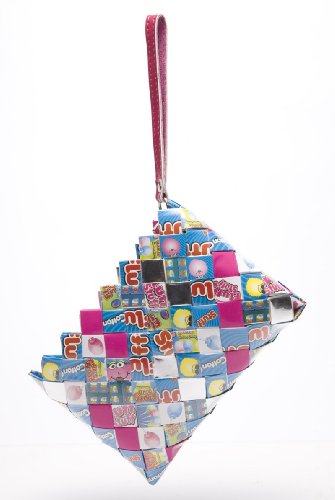 This Nahui Ollin Sweet Cheeks Candy Wrapper Wristlet is made from recycled materials. It can take up to 4000 wrapper and 4 days to construct one bag! Be Eco-fashionable and own a one-of-a -kind piece today. This cute pouch fits right on your wrist and is perfect to fit the essentials such as your keys, credit cards, phone or makeup. The zipper closure and leather wrist strap help keep your items safe and secure.