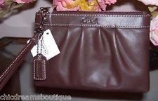 Coach medium wristlet in Bark (dk. brown) 48726E. This style has a pleated front, zip closure. 7 1/4" x 4 1/2" x 1 1/2" with wrist strap. Beautiful little bag.